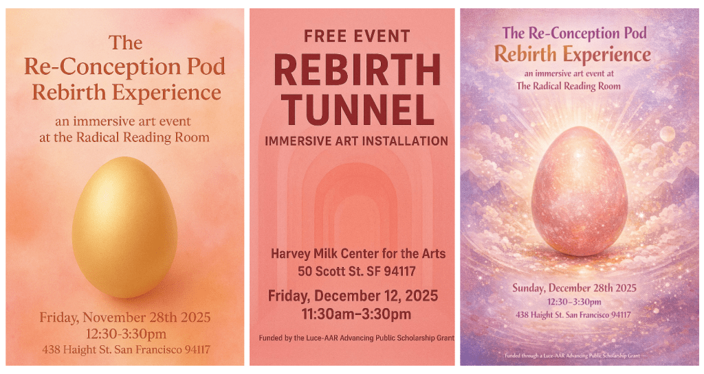 The Henry Luce Foundation and the American Academy of Religion have recently awarded my Rebirth Tunnel Immersive Art Installation a 2025 Luce-AAR Advancing Public Scholarship Grant, which has provided significant help in developing both the Rebirth Tunnel and Re-Conception Pods in the public sphere. Between November 28, 2025 and December 28, 2025, I created three Rebirth Events, two of which were held at The Radical Reading Room in San Francisco’s Lower Haight neighborhood and a third of which was held at the Harvey Milk Center for the Arts, also located in San Francisco’s Lower Haight.